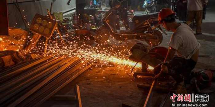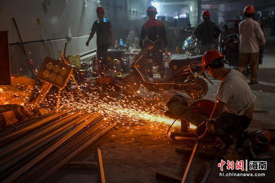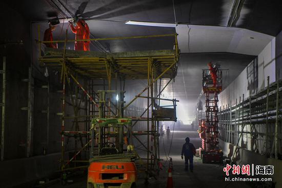 中新网海南新闻5月20日电(记者 尹海明 骆云飞)5月20日,海口天气炎热,海口文明东越江通道施工现场更是热火朝天,隧道内和隧道两端的路面上,千余名工人正在顶着烈日抓紧施工。