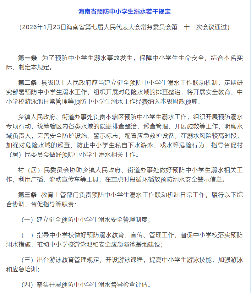 省人大常委会印发《海南省预防中小学生溺水若干规定》