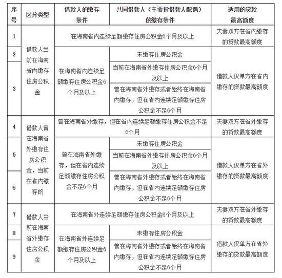 答:根据海南住房公积金管理委员会三届六次全体会议精神,只有在海南省内连续足额缴存住房公积金6个月及以上,且缴交状态为“正常”的借款人夫妻双方或借款人仅单方,可享受省内缴存住房公积金的贷款最高额度。其余条件的借款人夫妻双方或借款人仅单方,适用在省外缴存住房公积金的贷款最高额度(即异地贷款最高额度)。区分条件如下: