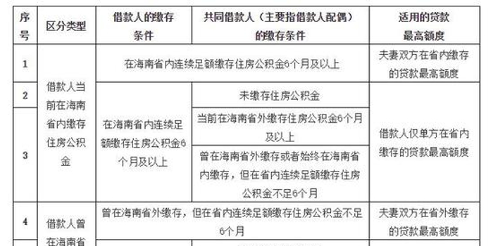 (一)明确省内外接续缴存职工的适用贷款额度。合并计算职工在海南省外和省内连续足额缴存住房公积金的时间,判断是否满足连续足额缴存6个月(含)以上的贷款基本条件。职工在省内连续足额缴存不足6个月的,其贷款最高额度仅适用异地贷款标准,不适用省内缴存贷款标准。以借款人的住房公积金缴存情况,作为判断借款人夫妻双方或借款人仅单方适用省内缴存贷款标准或异地贷款标准的依据。