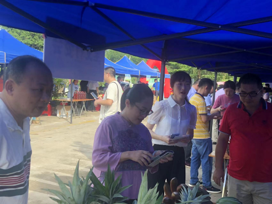 随后,符攀婵副县长等镇领导来到现场,带头逛认购农户产品,并掏出手机二维码支付,选购了南科蘑菇、紫蕉、山柚油、石榴、花生油、鸭蛋、酸菜、竹笋、菠萝蜜等特色产品,并开心告诉大家积极买买买,营造现场好的氛围。
