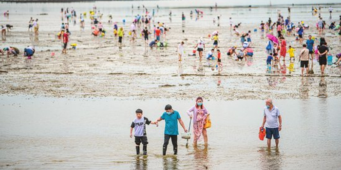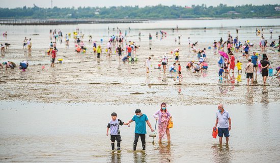 在美兰区演丰镇北港村,不少市民游客正在体验“赶海”活动。陈长宇 摄