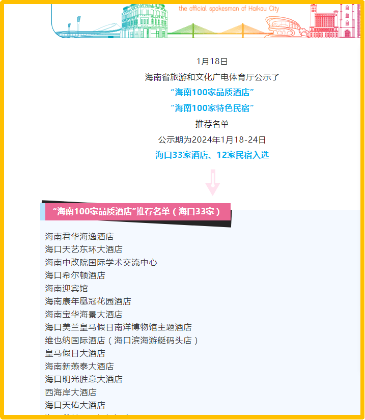 关注2024年1月18日,海南省旅游和文化广电体育厅公示了“海南100家品质酒店”推荐名单(海口33家)。其中,中改院国际学术交流中心入选“海南100家品质酒店”榜单。