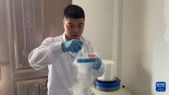 在万宁林兰水产养殖公司的实验室,科研人员查看冷冻保存的东星斑受精卵。新华社记者黎多江 摄