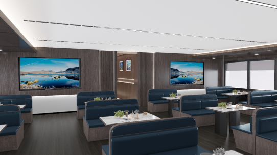 三层的互动式观光甲板配备现代光影技术,游客可以在这里打卡拍照,感受海风轻拂脸庞的惬意。晚上,这里还将化身海上酒吧,DJ秀点燃全场激情,让游客尽情享受狂欢之夜。