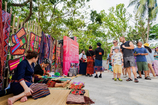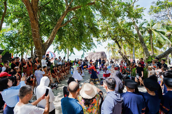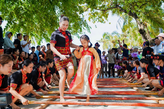 景区联合三亚市文化馆,推出大型黎族打柴舞展演,由50余名民间艺术家组成12米超长表演阵列,震撼演绎国家级非遗魅力。黎锦沉浸体验展、民族大联欢巡游、黎族婚俗互动巡游等活动,以“可观可感、可参与”的方式,推动非遗活态传承,展现海南文化的深厚底蕴。