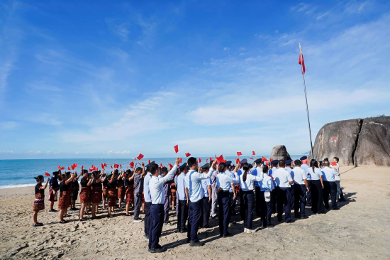 10月1日上午9时,“红旗漫卷天涯”国庆升旗仪式在天涯石沙滩隆重举行。碧海蓝天映衬下,五星红旗迎风飘扬,景区员工、市民游客共同肃立,深情表达对祖国的祝福。随后展开的“我为祖国送祝福”签名活动与“我为祖国唱支歌”快闪表演,营造出山海间独特的仪式感与浓厚的家国情怀。