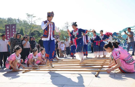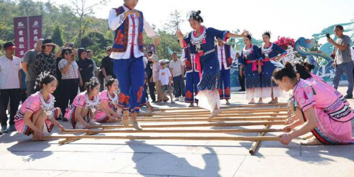 2026年新年第一天,伴随着竹竿敲打的咚咚声,身着民族盛装的舞蹈演员,在快速开合的竹竿间轻盈地跳跃,手上舞动出优美的动作,持竿者高呼“嘿!呵嘿!”。在暖阳中,演员与游客共跳竹竿舞,感受文化魅力,其乐融融欢度新年。
