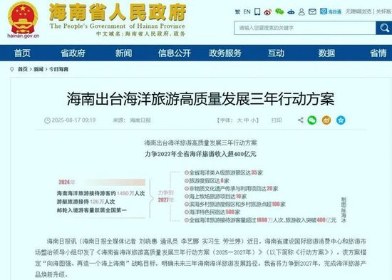 2025年8月初,《海南省海洋旅游高质量发展三年行动方案(2025-2027 年)》正式发布。