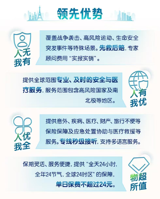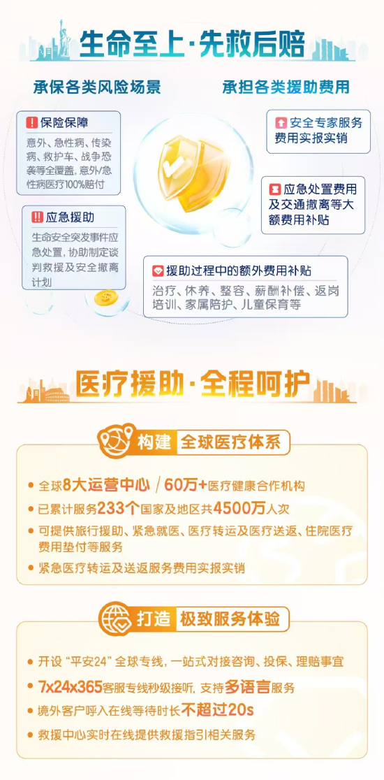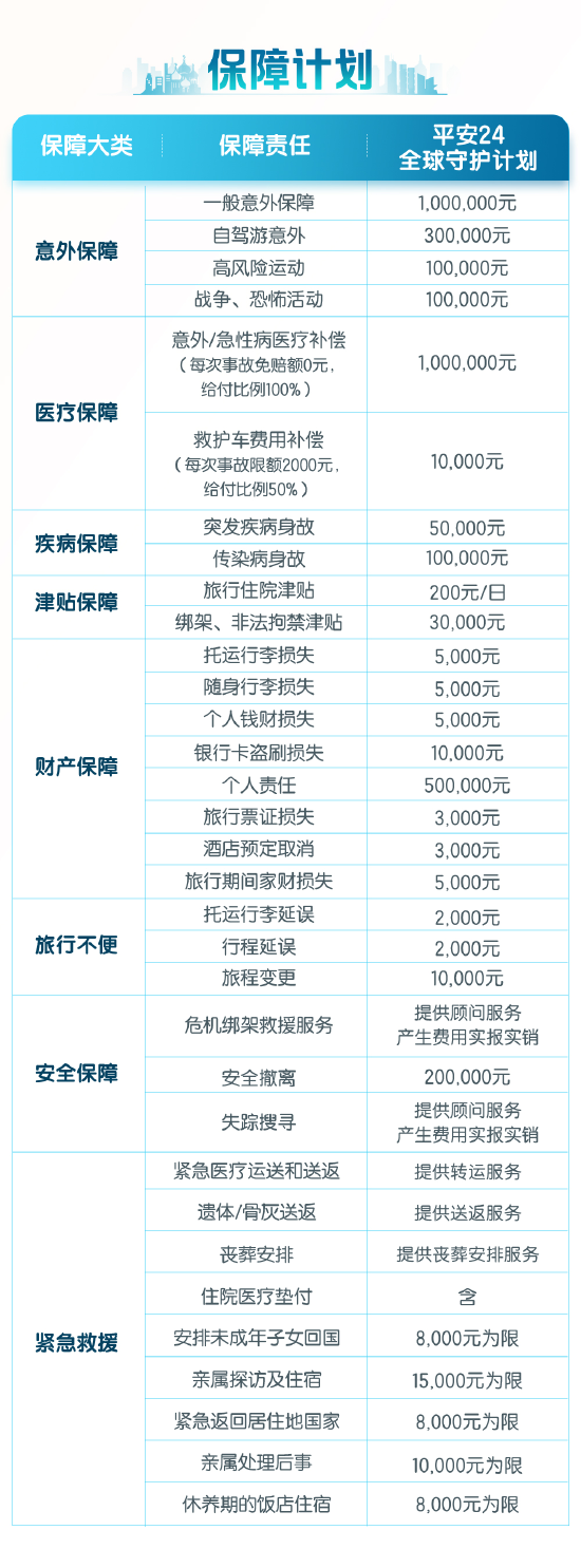 平安24全球守护计划囊括了30多种意外保障权益,支持短期出国按天购买服务,以极高的性价比让出海客户能够享受到全球优质的医疗、财产、疾病和安全保障。
