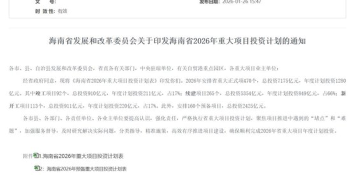 关注商报全媒体讯(椰网/海拔新闻记者 郭尚)1月29日,记者从省发展改革委获悉,《海南省2026年重大项目投资计划》已于日前印发,为全年重大项目建设描绘总体蓝图、明确资金投向。根据投资计划,2026年海南共安排省重大项目470个、预备项目160个,覆盖基础设施建设、产业发展、民生保障和生态环境保护等关键领域。