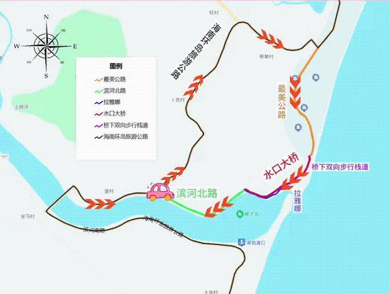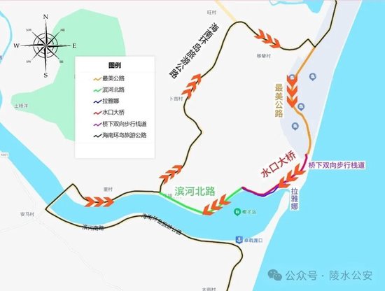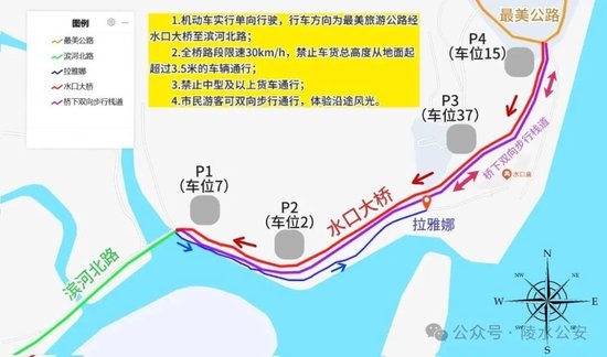 1。机动车实行单向行驶,行车方向为香水湾最美旅游公路经水口大桥至滨河北路;
