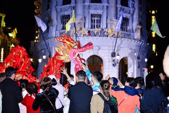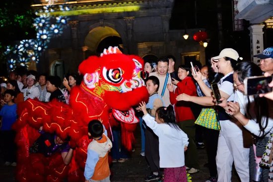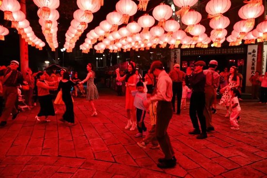 除了拍照打卡,夜间电影公社还安排了多场互动演出。晚上7时20分,江城谣景区十字街突然响起欢快的爵士乐,一场“情景快闪·摇摆舞”瞬间点燃街区气氛。身着复古服饰的舞者从人群中跃出,带动游客一起摇摆。来自上海的游客林小姐被朋友拉进舞圈,虽然动作生疏,却笑得格外灿烂:“太惊喜了!本来只是来拍照,结果被拉去跳舞,这种沉浸式体验很难忘。”“我们是下午才入园的,本以为晚上就是看看灯,没想到还有这么多节目可看。”来自四川的游客张先生抱着孩子参与了互动,“孩子玩得不想走,这种氛围感确实好,年味很足。”