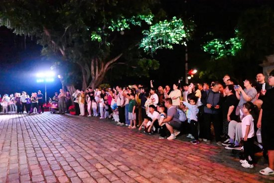 晚上7时50分,南洋潮景区红方旅馆内的实景喜剧《谁是卧底》开演。观众被随机分组,参与剧情推理,现场笑声不断。“第一次在景区玩这种互动喜剧,既有表演又有游戏,全家老小都参与进来了。”来自广州的游客陈先生表示,电影公社的夜游活动设计用心,让不同年龄段的游客都能找到乐趣。