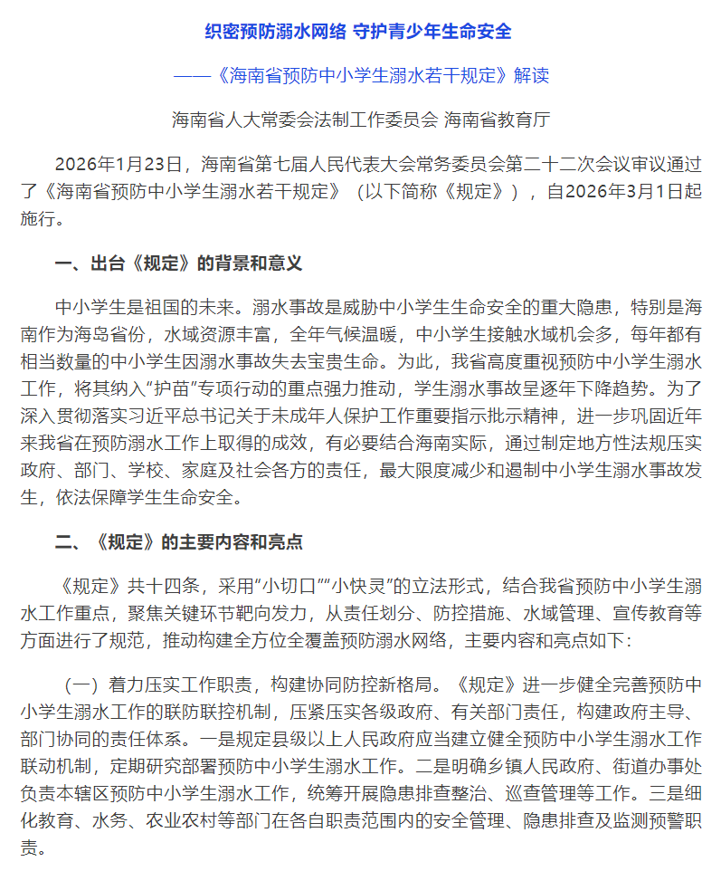 《海南省预防中小学生溺水若干规定》已由海南省第七届人民代表大会常务委员会第二十二次会议于2026年1月23日通过,现予公布,自2026年3月1日起施行。