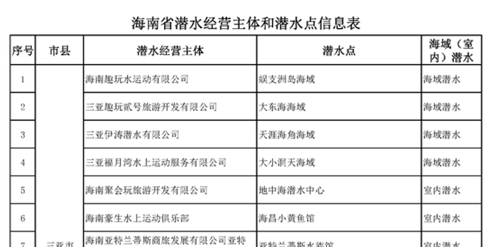 近日,海南省旅文厅官网发布了海南省潜水经营主体和潜水点信息表。信息显示,全省共有潜水经营主体21家、潜水点21个,集中分布于三亚、陵水和万宁三个市县。
