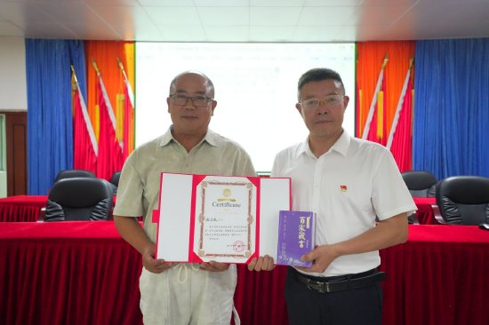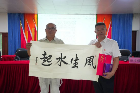 讲座结束后,研究会副会长李小勤代表研究会向番阳镇人民政府赠送《百家箴言日历》及《海口市非物质文化遗产》丛书;同时为范才成博士颁发荣誉证书,并代为赠送顾问林长武创作的书法作品“风生水起”。互动交流环节,观众围绕非遗传承、文旅融合、乡村振兴等话题与主讲人深入探讨,进一步深化对海南文化的认知与理解。