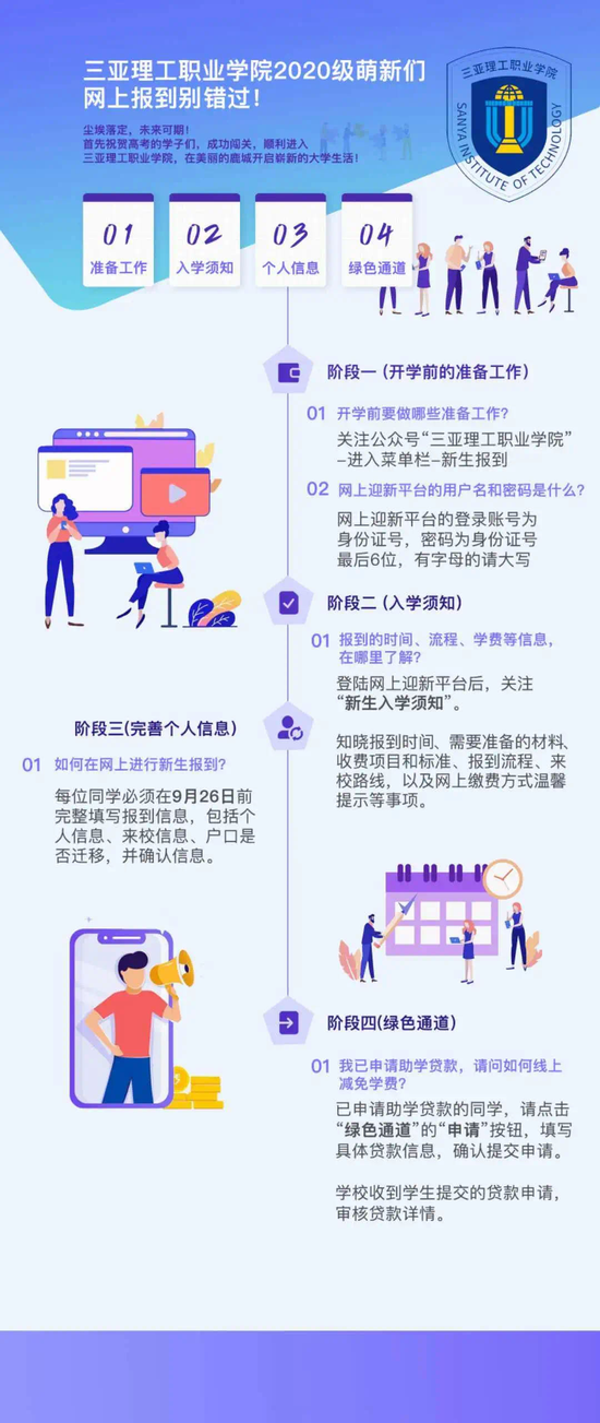 据了到,三亚理工职业学院今年首次增加了线上报到方式作为线下报到的补充。线上报到设置新生须知、绿色通道等窗口,新生们在线上先完成报到信息的填写,有助于提前了解学校迎新安排,加快线下流程。