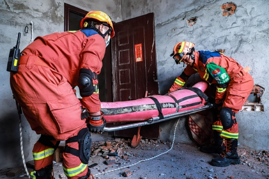 到达指定地点后,消防救援力量立即根据灾害现场情况开展救援行动。分别开展了门框支撑保护、向上破拆救援、向下快速破拆、向下安全破拆、狭小空间救援、横向破拆救援、断崖垂直救助、绳索斜下救援、区域搜索救援、重物顶撑救援、现场医疗急救、72小时自我保障等17个科目演练。