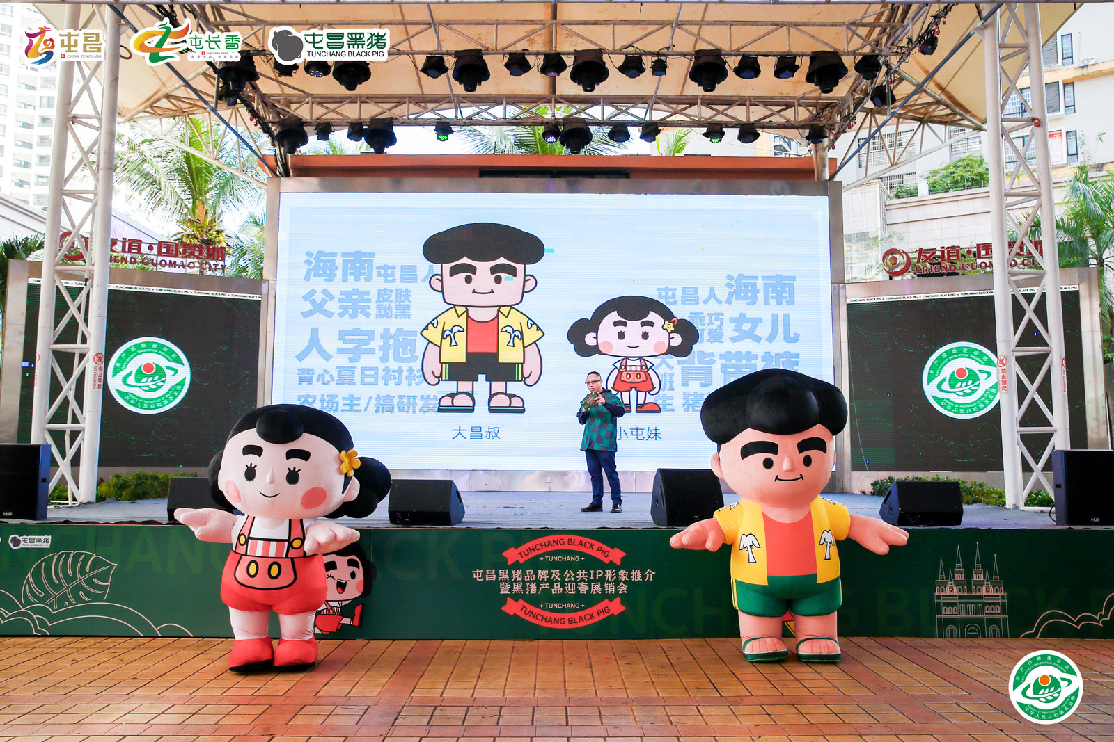 活动现场,屯昌黑猪产业品牌葫芦猪是一只圆润的黑猪形象,就像一只葫芦般生动可爱。此外,现场也公布了县域公用IP形象大昌叔与小屯妹。大昌叔是朴实的农场主形象,以现代化农牧业的思路建设着自己的农场;而小屯妹则是一位软萌的小女孩,爱美爱玩。两大公用IP形象生动的呈现了屯昌的地域特点与人文风貌,是屯昌独树一帜的匠心创造。一经亮相便受到了市民游客的关注,更引来许多小朋友合影拍照。