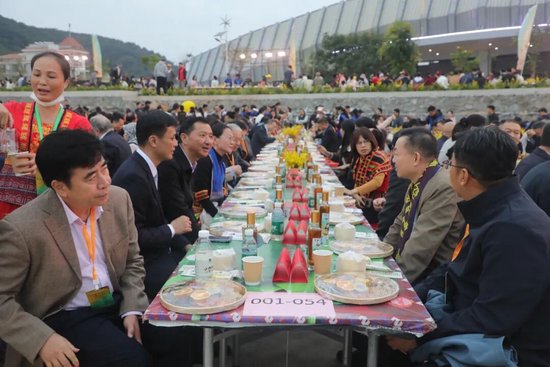 傍晚时分,依景而设的大地长桌盛宴让宾客分享“舌尖上的白沙”。长桌宴之上,山兰系列美食、黎家特色菜肴风味独特。宾客在品尝美食的同时,聆听着悠扬的“嘞乐”黎族音乐会。