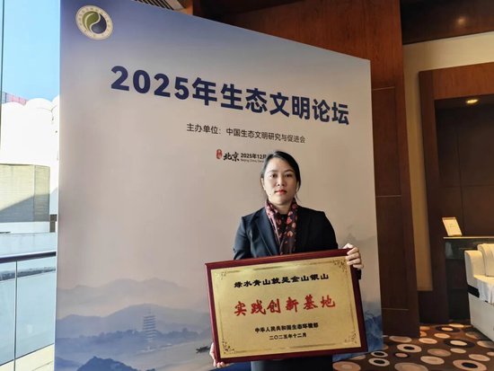 演丰镇委书记李海花参加2025文明生态论坛并接受“绿水青山就是金山银山实践创新基地”授牌。