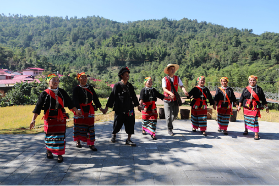 图:刘圣伟(右4)与当地村民共唱幸福歌
