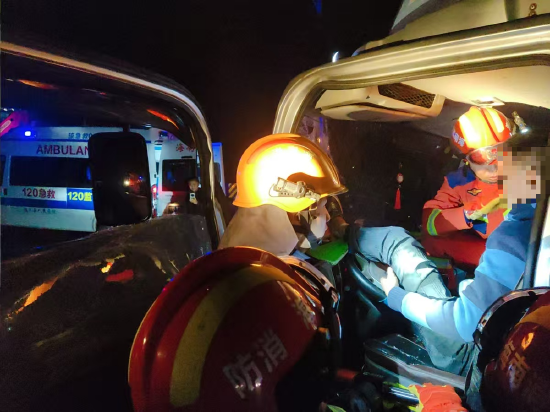 6时10分,消防救援人员将被困男子救出,移交给现场120医护人员,经现场120医护人员观察,驾驶员仅腿部轻微擦伤。