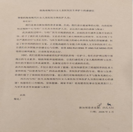关注2026年1月11日下午,因早产导致支气管肺发育不良(BPD)进入慢性阶段的新加坡籍兄妹——3岁的哥哥安安和1岁的妹妹萌萌,在海南现代妇女儿童医院慢肺中心顺利完成阶段性治疗,成功脱氧出院,启程返回新加坡。出院当日,患儿父母将一面写有“大爱无疆卫健康 医者心暖四方”的锦旗赠予慢肺中心主任马明广,衷心感谢其专业、细致的诊疗,以及医护团队给予的温暖照护与无私付出。