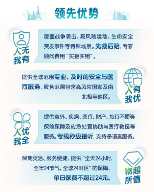 平安24全球守护计划囊括了30多种意外保障权益,支持短期出国按天购买服务,以极高的性价比让出海客户能够享受到全球优质的医疗、财产、疾病和安全保障。