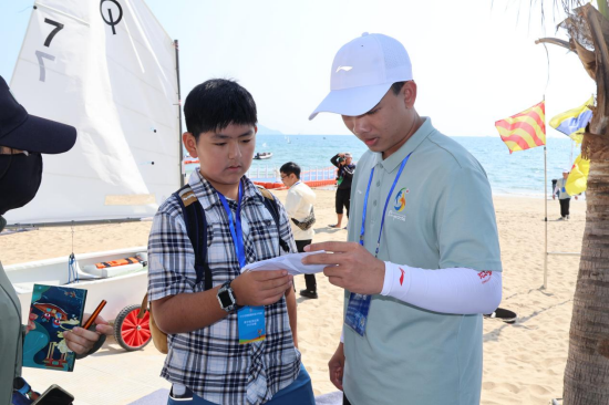 在“亚沙知识课堂”环节,亚沙讲解员生动讲述了亚沙会的历史渊源、测试赛的核心项目,并重点介绍了场馆建设中采用的绿色科技与临时设施改造理念。通过讲解,小记者们了解到本次三亚亚沙会帆船测试赛是亚沙会系列测试赛的“首秀”,旨在通过全流程、全要素演练,为正赛积累经验、优化流程。