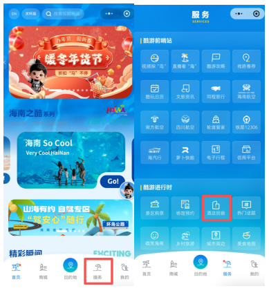 游客可登录“酷游海南”小程序,进入“服务”页面,在“酒店民宿”栏目中找到“酒店住宿保险推荐”选项,即可进行投保。