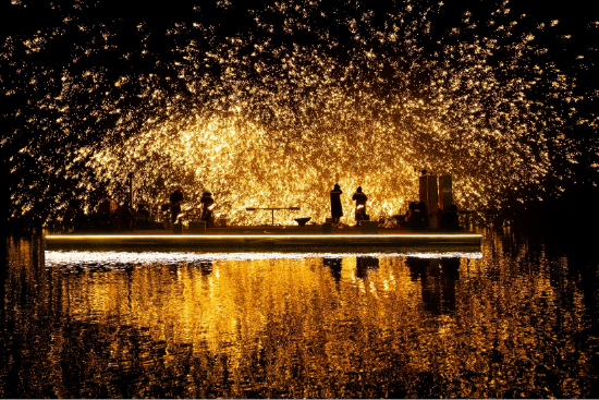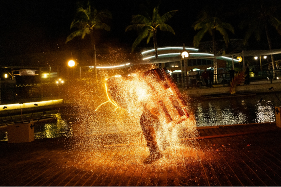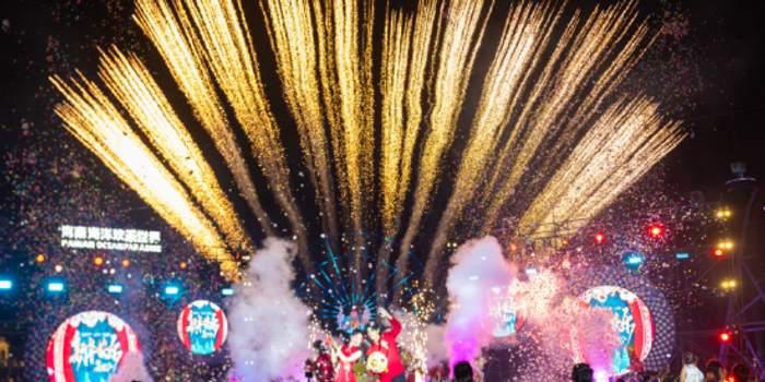 与国际演艺相映衬的,是景区精心打造的“非遗天花板”盛宴。首次登陆海南的国家级非物质文化遗产“凤台火老虎”以1600℃铁水挥洒出璀璨的“铁水金雨”;源自北方的打铁花在南海夜空绽放,通过“火壶”“风火轮”等绝技勾勒东方龙图腾。