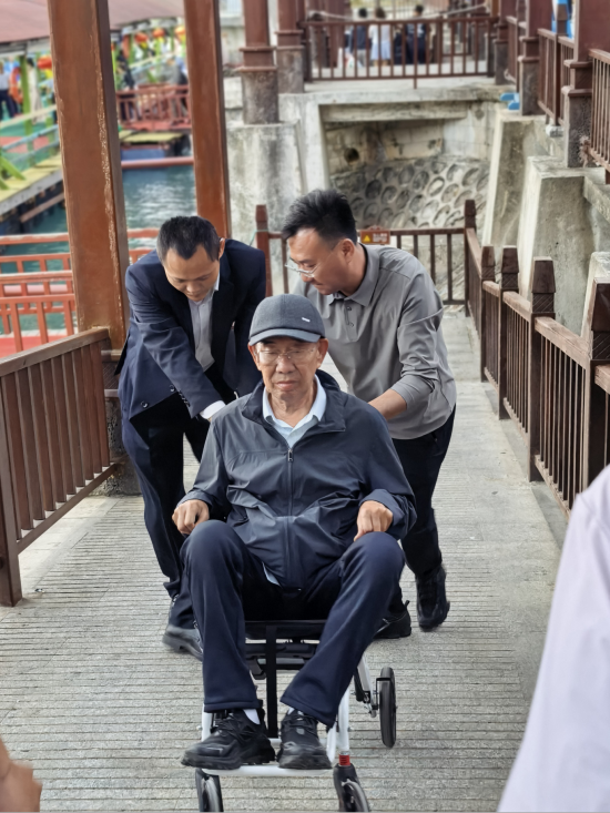分界洲岛工作人员帮助坐轮椅的游客登岛。