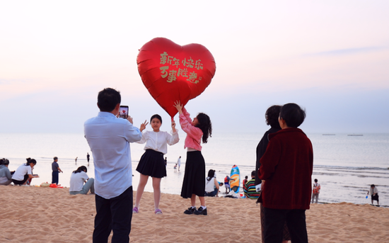 今年春节,假日海滩旅游区同样欢声笑语不断。温暖的阳光下,市民游客或赤脚踩沙漫步,或追逐浪花嬉戏,尽情享受亲水乐趣。