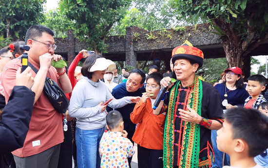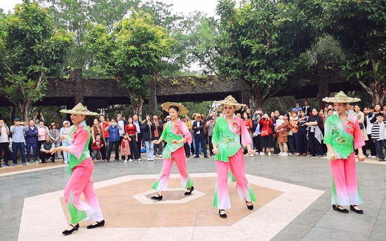 海口火山口公园从大年初二至初五推出的传统年俗体验活动人气爆棚,精彩的民俗歌舞表演引得游客纷纷驻足。竹竿舞的清脆节奏中,身着民族服饰的演员们轻盈跳跃,不少游客跃跃欲试,加入舞动队伍,现场欢声笑语不断。