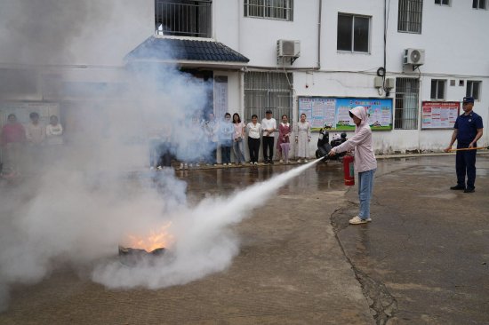 室外飘着小雨,实操环节却照常进行。老师们站在屋檐下,轮流上手体验灭火器。宣讲员拎起灭火器,现场拆解“提、拔、握、压”四步法。有人第一次操作有点手生,旁边的同事立马指导:“瞄准根部!压!”雨点打在空地上噼里啪啦响,屋檐下的学习氛围却一点没减。