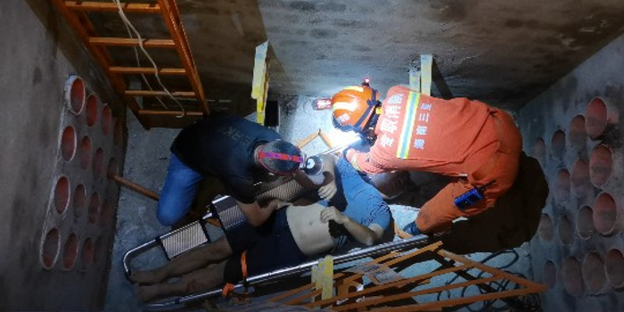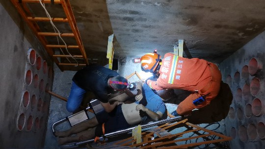 消防救援人员抵达后,经侦查发现,被困男子意识清醒,但身体无法动弹,救援刻不容缓。指挥员当即下达指令,一组人员迅速对现场进行警戒,另一组人员架设救援拉梯,深入坑底施救。