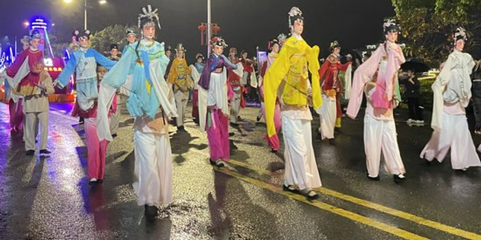 当晚,花车巡游率先点燃节日氛围,临高本土特色非遗与民俗节目集中亮相、精彩呈现。人偶戏、临剧、八音盅盘舞、渔歌哩哩美等特色文艺表演依次登场,演员们身着特色服饰,伴着悠扬旋律缓步前行,动作舒展、唱腔韵味十足,将临高深厚的文化底蕴与浓郁的民俗风情生动展现。