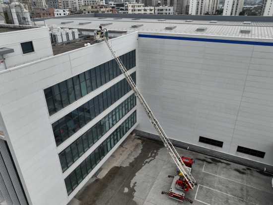 火势得到初步控制后,消防救援力量持续巩固处置成果,利用云梯车出水对建筑外部墙体、屋顶进行冷却保护,提升建筑耐火极限,严防坍塌等二次衍生事故发生。整场演练中,救援人员直面“高温、有毒、易燃”的复杂环境,规范操作各类专业装备,各单元衔接紧密、配合默契,圆满达成“控火、救人、堵漏、防险”的核心处置目标。