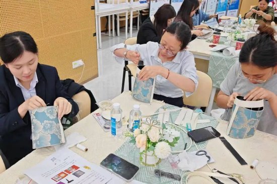 非遗传承,匠心永恒。作为本次活动的核心环节,非遗宋锦手工包制作体验让大家近距离感受传统工艺之美。活动特别邀请专业非遗老师现场讲解宋锦文化,从千年底蕴到制作技巧细致分享,带领大家一针一线亲手制作宋锦手工包。大家沉浸在手工创作的乐趣中,在指尖的穿梭里感受宋锦的华丽精致,释放工作压力,收获独属于自己的非遗手作美好。