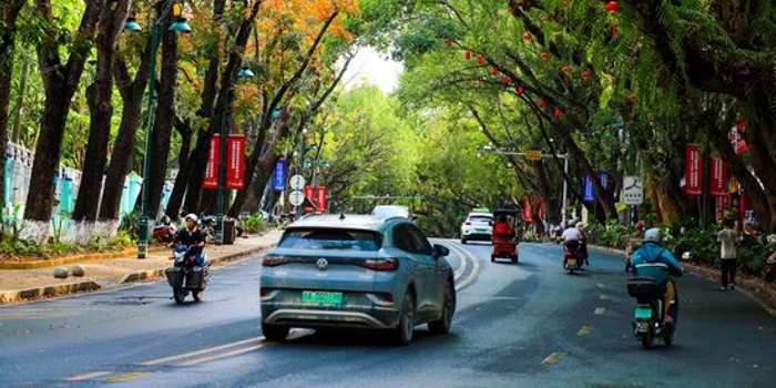 作为承载黎苗文化的核心要道,大道两侧枝桠间,一侧鲜翠新叶缀满枝头,漾着初春生机;一侧金黄叶片轻落,铺就秋日诗意。