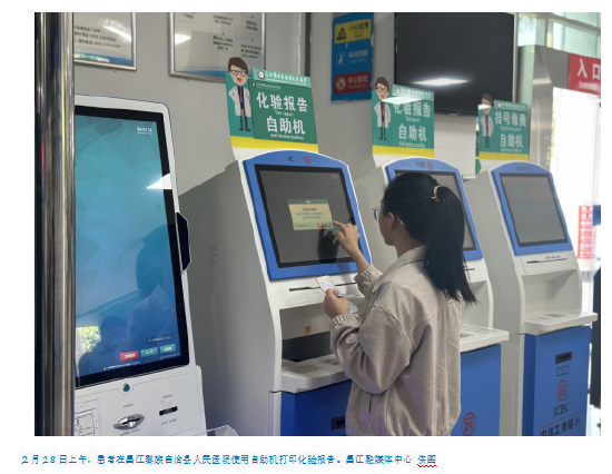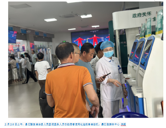 长期以来,挂号排队长、就医流程繁琐等问题一直是困扰患者就医的“痛点”。此次升级以“互联网+医疗”为核心,依托自助挂号机、智能导诊屏、诊室呼叫系统等智能化设备,推动门诊挂号、分诊、缴费、报告查询等全流程自助服务落地。如今,在昌江县人民医院和昌江县中西医结合医院,患者可通过一体机完成多项操作,显著减少窗口排队时间;智能导诊系统实时分配就诊时段,各诊室外电子屏同步显示医生信息与叫号进度,有效改善候诊环境,提升就医体验。