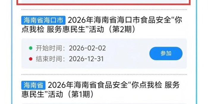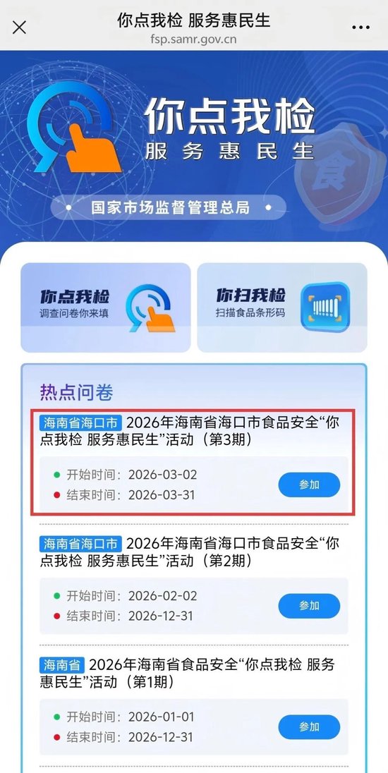 为守护您“舌尖上的放心消费”,海口市市场监督管理局紧扣 “点检惠民生,食安促消费” 主题,正式启动2026年食品安全 “你点我检 服务惠民生” 活动,线上线下同步发力,诚邀广大消费者积极参与,共同筑牢食品安全防线!