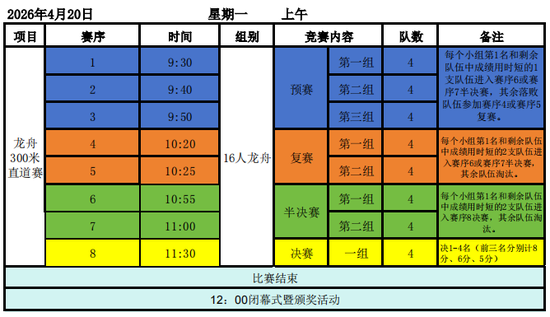 本次龙舟赛定于4月20日9:30鸣锣开赛,赛事设置16人小龙舟300米直道竞速赛项目,将会是一场兼具竞技性与观赏性的水上体育盛宴。