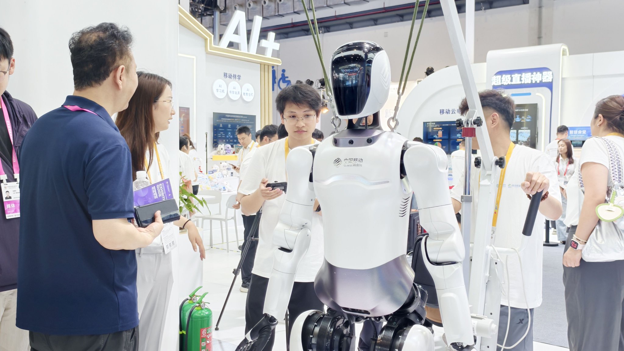 展会上,中国移动自主打造的四足机器狗、灵犀人形机器人等黑科技产品成为人气焦点。“机器狗是中国移动自主打造的首款四足机器人,我们将多模态大模型赋能其中,打造出集自然语言理解、精准视觉认知、智能仿生行为、灵巧敏捷运动于一体的科技萌宠,目前已广泛应用于居家、外出陪伴、文化展演等多元场景。”中国移动杭州研发中心品牌运营刘金玲介绍道。此外,灵犀人形机器人也颇具亮点,它不再是单一功能的机器,而是集迎宾接待、讲解导览、智慧运营、赛博热舞于一体的全能智能体,真正实现“一机多能,场景无限”,相当于一个人能承担四份工作。